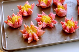 油皮包椰蓉球,收口向下,用锋利的刀片割出花瓣,预留两个油炸,烤箱预热170度