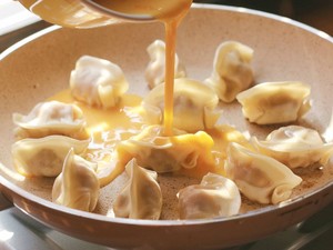 倒入加了盐和料酒的蛋液。继续盖上锅盖小火加热。鸡蛋图片用了3个,可适量调整。我觉得饺子不多2个鸡蛋差不多了,一个人饭量不大的话1个也够了