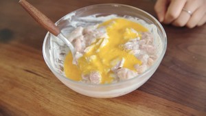 在腌好的鸡肉中加入蛋液,搅匀