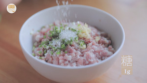 [白玫瑰煎饺] 200g猪肉糜加入5ml料酒、5ml生抽、3g葱姜、1g盐、1g糖。
