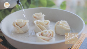 锅内倒入10ml食用油,放入玫瑰花饺。