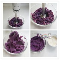 紫薯加入适量牛奶用手持搅拌器打成紫薯泥,超级惊艳得到这么顺滑的紫薯泥。 因为山药具有黏性不推荐用搅拌器以免损坏,所以加牛奶后入保鲜袋用擀面杖擀成泥。