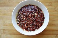 等油七成热时,将油倒入辣椒碗中,搅拌下,放置段时间即成辣椒油