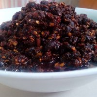 倒入和有蒜碎的黑豆豉,中火翻炒5分钟。然后倒入海椒面。关小火翻炒2分钟。放佐料(盐,味精,鸡精,酱油,白糖)在翻炒1分钟。起锅。美味的老干妈就做好了。