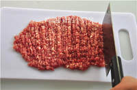 在肉糜的表面铺上一张保鲜膜,用擀面杖将肉糜擀成薄厚均匀的片状。