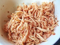 将鸡胸肉用白水煮熟,大概几分钟就好,用筷子戳一下就知道啦!然后稍微晾凉一点,手撕成条状,喜欢有口感的,可以粗一点,跟我一样喜欢丝的,可以在这步多花一点时间撕细一些!