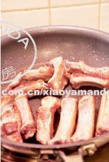 锅内放少量油烧热,下一半姜片爆香后下排骨,大中火煎3、5分钟至两面发黄