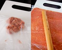 取一团肉馅放入大号保鲜袋中,隔着保鲜袋用擀面杖轻轻的将肉馅擀平,尽可能擀的薄一些。(此配方中的量,大概能擀3-4片肉脯)。 擀好的肉馅连同案板一同放入冰箱的冷冻室冷冻2小时左右至变硬。