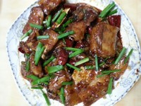 蒸好鱼干后!捞出,剩余的蒸鱼汁水千万不要倒掉哦!炒锅里下油,入姜丝,豆瓣酱,炒出红油后!倒入鱼干!炒出香味!加入干辣椒!继续翻炒,慢慢加入剩余汤汁!待汤汁收干,加入葱花既可关火