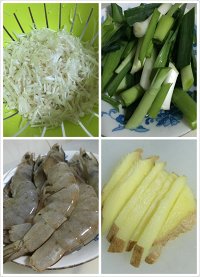 所有食材洗净后, 海虾挑掉虾线; 金针菇、青蒜切小段; 姜切丝