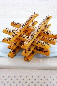 表面刷上一层蛋黄液,均匀的撒上黑白芝麻,切成长条状。