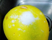 先用盐巴把柚子皮洗干净。现在的水果外面都可能有保鲜用的食用蜡,用盐巴可以洗干净哟。