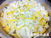 柚子皮切片,自己觉得合适的大小即可。用淡盐水浸泡柚子皮。