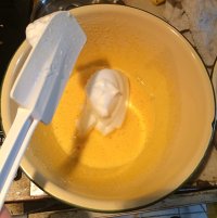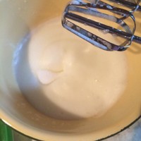 将拌好的蛋黄倒入剩余蛋白里 切拌 (想省事的话将打好的蛋黄直接倒入蛋白内 打蛋器高速打1分钟就好了)