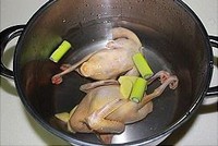 烧开一壶水,将鸽子汆烫下并清洗,处理好的鸽子放进锅里