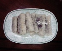 噔噔噔~这些材料可以做如图的紫薯卷呦~(步骤4说过不要扔掉的塑料膜,这时候可以用来隔开相邻的紫薯卷,目的是防止它们互相粘粘哦~吃不完的紫薯卷可以先别油炸,放到冰箱里密封冷藏或冷冻着。)