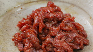 首先处理牛肉。这道菜选用的是肉质细嫩的牛里脊肉,剔去白色筋膜,横切成片后,再从与纹理垂直的角度,将牛肉切成丝;