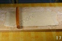 用擀面杖再次擀成长方形。擀的时候,由中心向四个角的方向擀,容易擀成规则的长方形