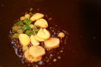 锅内留着煎三文鱼和豆腐的油,放入葱姜蒜爆香。
