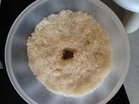 4、我用的是密封的保鲜盒,放凉的糯米一层一层的放入保鲜盒,一层糯米均匀的加一点酒饼水,我使用温开水把自己的爪爪冲干净再伸进糯米中,使糯米和酒饼水均匀混合。最后留一点酒饼水,把糯米中间挖个坑,剩的那点酒饼水加入洞里。