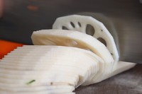 Tip:1.莲藕要选择通气孔较大、节间距长、外形饱满的,带有湿泥土的尤佳; 2.用冰水使藕片瞬间降温,可使之口感更爽脆。