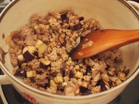 锅子预热,加入沙拉油,倒入洋葱煸炒香。然后加入猪绞肉,慢慢炒出肉汁来,最后放入茄子丁炒匀。