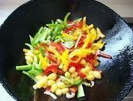 炒里脊丝至颜色发白后倒入切好的彩椒丁翻炒1分钟,加入适量的食盐、鸡精翻炒均匀即可