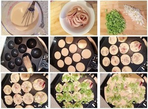 1、鱿鱼圈(没买到鱿鱼)清洗干净,水烧开将鱿鱼圈放入,水再次开后,将鱿鱼取出过一下冷水,切成丁;(大虾 去皮挑沙线,和鱿鱼一起煮一下,然后切成几块,另外鱿鱼也要切大一点块,不要像我图片上那么小) 2、用油扫将模具均匀的扫上油大火加热 然后转小火 倒入面糊(面糊最好装在量杯里) 大约7分满 3、放入鱿鱼丁、虾肉; 4、撒上洋葱碎(后来觉得不入洋葱更好吃); 5、均匀的撒上包菜丁~再倒些面糊;