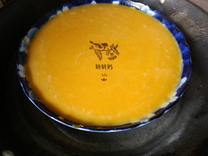 将南瓜泥与牛奶蛋液拌匀.加少许盐提鲜,隔水慢火蒸熟.(约15分钟吧记得慢火.最好就盖上一只碟在上面蒸.使蛋羹更嫩滑)。