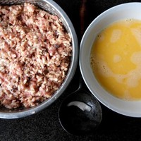 泡发香菇,切碎成小丁(香菇水沉淀过滤备用);马蹄削皮,切碎成小丁;先将肉馅调好味,加入小半碗香菇水朝一个方向搅打上浆,再加入香菇碎、马蹄碎、适量油搅拌均匀。