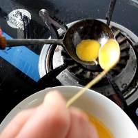 舀一勺蛋液入钢勺内。舀蛋液的勺子很重要,最好一满勺舀进去刚好摊一个蛋饺的蛋皮,最好是长柄勺,这样勺柄不会淹没在蛋液里。选择一把合适的勺子舀蛋液,会加快做蛋饺的速度,因为做完8个蛋液量的蛋饺,需要两个小时左右!我们家这个勺子是雀巢咖啡里那把金色的长柄勺,一勺的量刚刚好摊一个蛋饺皮。