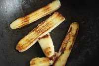 香蕉切成三片,长条形,锅内入油,待油温到6成后放入香蕉片,煎成焦黄状(原文说明)但我第一次操作失败了,油其实也只放了一点点,但是还是太多。