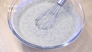 所有干性材料混合均匀(粘米粉、低筋面粉、泡打粉、细砂糖、黑芝麻粉)。