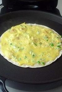 将一张卷饼放入电饼铛,倒上葱花蛋液,鸡蛋凝固即可取出