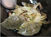 螃蟹洗干净,去蟹脐,,打开蟹盖,去腮,切小块