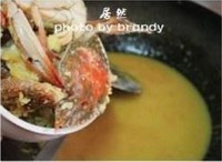 锅里继续倒入少许油,把鸡蛋液和螃蟹一起倒入锅里,煎至蛋液凝固即可,倒入刚刚起锅的姜末等一起翻炒片刻即可装起