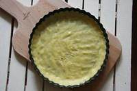 1小时后从冰箱取出,在撒了面粉的台面上用擀面杖擀开,放入派模,去除多余部分后再放入冰箱冷藏一小时(不冷藏的话,烤的时候会缩)