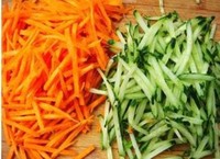 胡萝卜去皮切成丝,黄瓜切成丝,绿豆芽摘去头尾部洗净备用