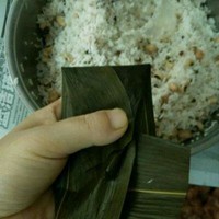 左边也附上一张粽叶,加上糯米盖住五花肉。