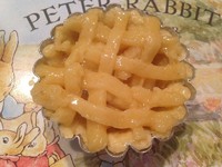 取出冰箱内的两个面团,其中一个擀薄切成细条编制成格子放在挞上,另一个擀薄直接放在挞上。(照型纯属个人喜好,大家可以自己DIY)刷上蛋液,如图。(喜欢芝麻的朋友,可以洒点上去也不错)