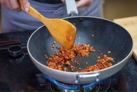 之前煎出的鸡油倒入锅里,再加入打碎的辣椒,直到炒出焦香味