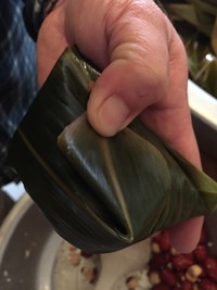 左边这样压下去,用大拇指按住,保证糯米都被裹在粽叶里面了。