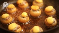 锅中热油,放入酿好的口蘑小火煎,再倒入调好的汁