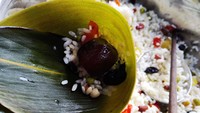 Tip:1、粽叶不泡直接用开水煮,可以试试,有没有弹性,我就不知道了。如果你不担心叶子的弹性,就不用泡吧,冲冲就行,先泡后洗,否则容易烂,烂了的就没法包了,会漏米,漏了就是竹叶稀饭了,一大锅。 2、再忙,米也至少要泡两三个小时,否则硬心,口感不好,不软糯。 3、如果大叶子,棱角分明的更好包,大叶子甚至可以把最底下尖尖处都打一下折的。如果叶子太窄,还有个办法,就是差不多在中间折叠,这样就可以从两面都包到比较多的叶子,米就不会漏出来了。