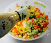 胡萝卜丁和玉米粒放凉后,跟黄瓜丁混合,放盐调味