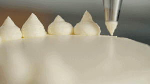 把剩下的奶油装入小圆口嘴的裱花袋中,开始裱花,等圆锥形的奶油花铺满后,成品很像佛祖的脑袋