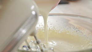 在蛋糊内分三次筛入低筋面粉,加盐,翻拌均匀