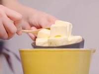 将150克黄油放入奶锅中加热融化,沸腾时撇去浮沫,关火静置,会有乳白色固体沉底,取浮在上层的金色透明液体,即澄清黄油备用。