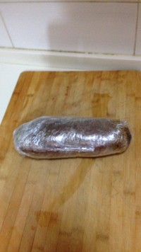 用保鲜膜紧紧的包住,包圆!别怕费保鲜膜。这是包好的样子,直接放进冰箱冷藏!吃的时候直接拿出来切就行啦!