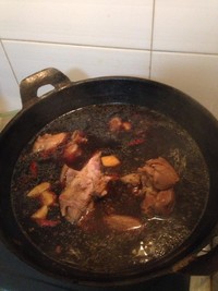 紧接着放花椒,大料,大葱,姜,白糖一汤勺,干辣椒六七个。中火炖